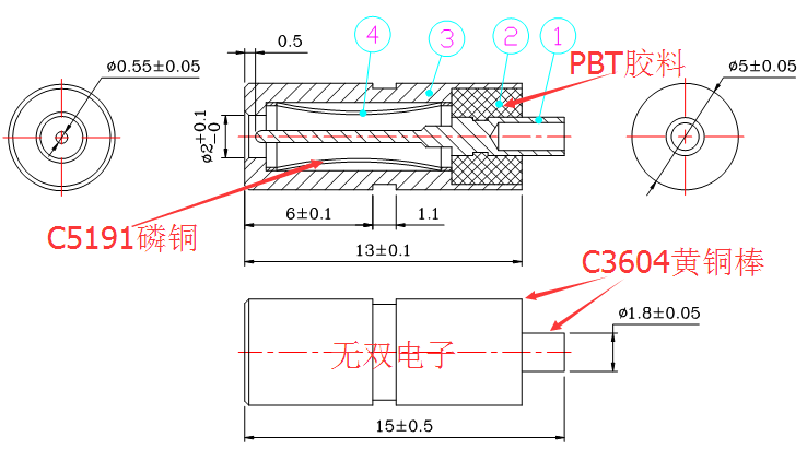 材質(zhì):外管、中心針:C3604黃銅棒;彈圈:C5191磷青銅;膠料:PBT膠料