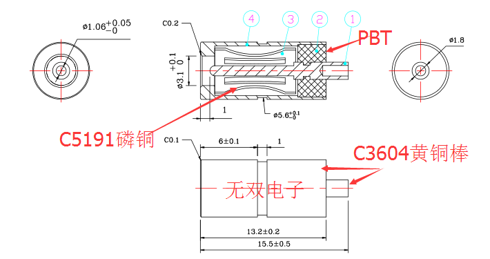材質(zhì):外管、中心針:C3604黃銅棒;彈圈:C5191磷青銅;膠料:PBT膠料