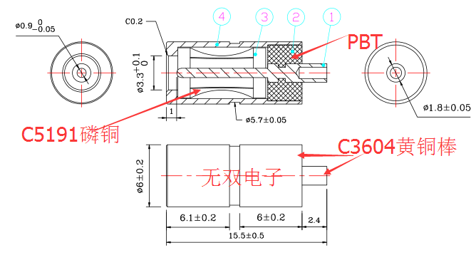 材質(zhì):外管、中心針:C3604黃銅棒;彈圈:C5191磷青銅;膠料:PE膠料