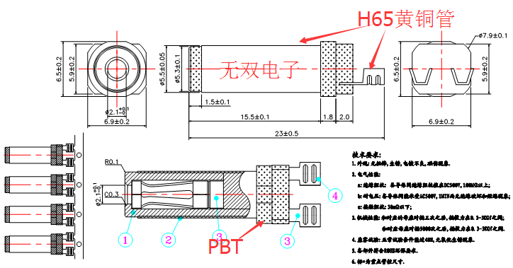 產(chǎn)品描述:OD=5.5mm,ID=2.1/2.5mm,L=22.5mm;雙線夾,黑膠及其它顏色,鍍層為鍍鎳或鍍金;自動(dòng)端子機(jī)壓線,不用焊接.
