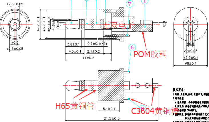 產(chǎn)品描述:2.5*21.5六極8.0盤插針,黑膠/白膠及其它顏色,鍍層為鎳或金.