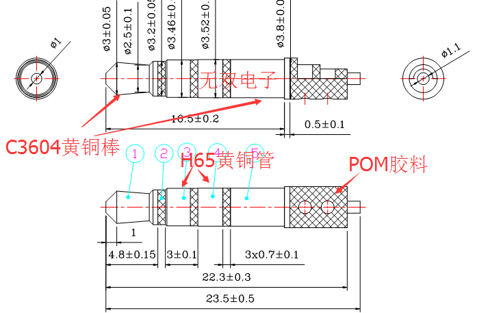 材 質(zhì):一段,四段C3604黃銅,二,三段H65,膠料:臺(tái)灣寶理POM環(huán)保料