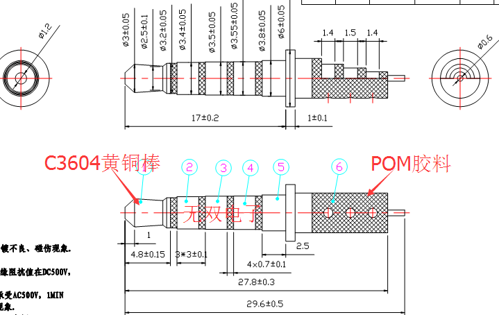 材 質(zhì):一段和四段C3604黃銅,二,三段H65黃銅,膠料:臺灣寶理POM環(huán)保料