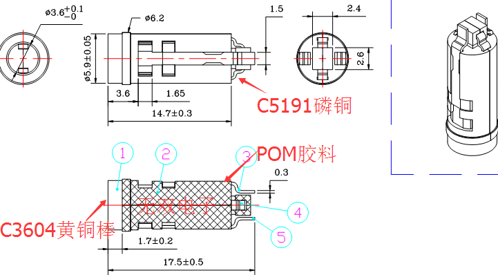 材 質:外管C3604黃銅,彈片C5191磷銅,膠料:PBT環(huán)保料