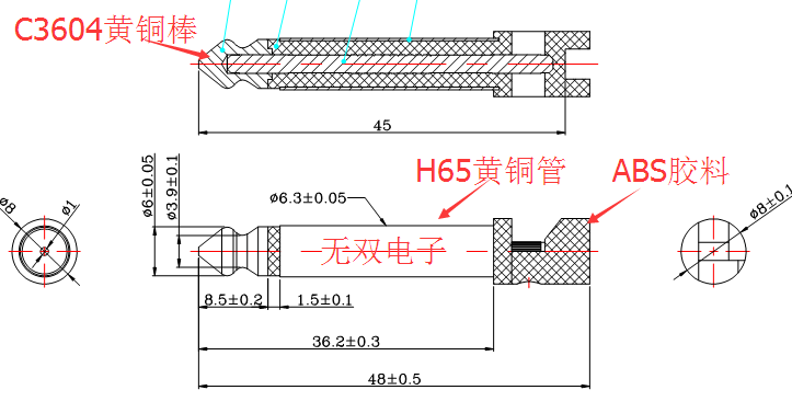 材 質(zhì):一段和三段C3604黃銅,二段H65黃銅,膠料:臺(tái)灣寶理POM環(huán)保料
