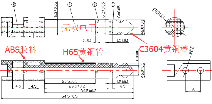 材 質(zhì):一段和三段C3604黃銅,二段H65黃銅,膠料:臺灣寶理POM環(huán)保料