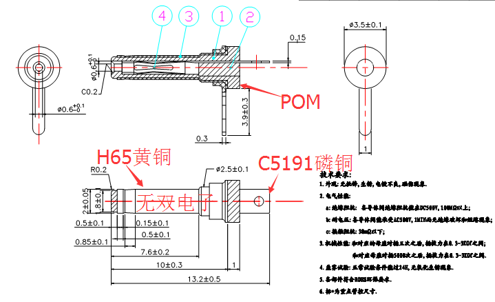 1、耐電壓:AC500V,漏電電流0.5MA,一分鐘無(wú)異狀 2、絕緣阻抗:大于100MΩ 3、插拔力:0.3-3KG 4、使用壽命:插拔5000次以上 5、使用范圍:-20℃-----+80℃ 6、鹽霧試驗(yàn):可達(dá)到24小時(shí)以上 7、導(dǎo)通:無(wú)短路,無(wú)斷路現(xiàn)象 8、焊錫性:溫度控制在350℃±10℃, 焊錫時(shí)音3-5秒鐘,擴(kuò)散良好,被焊錫物拉拔不造成焊面脫 離,容易上錫 9、保存:在室溫下,放在干燥通風(fēng)處
